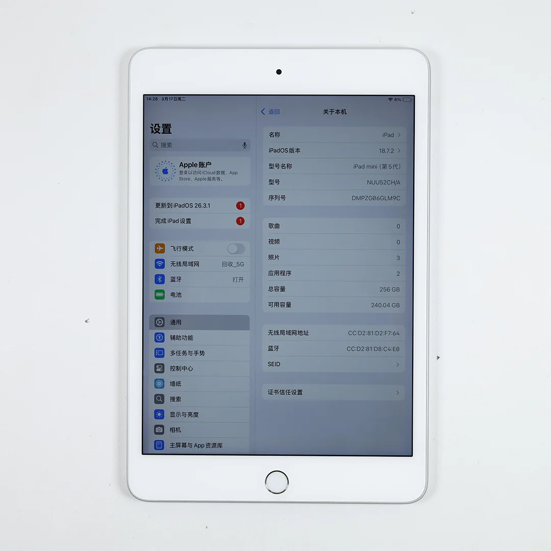 9新 iPad mini 5 WIFI版 银色 256G 国行官换机 81%电池882次充电
