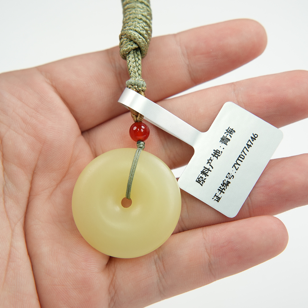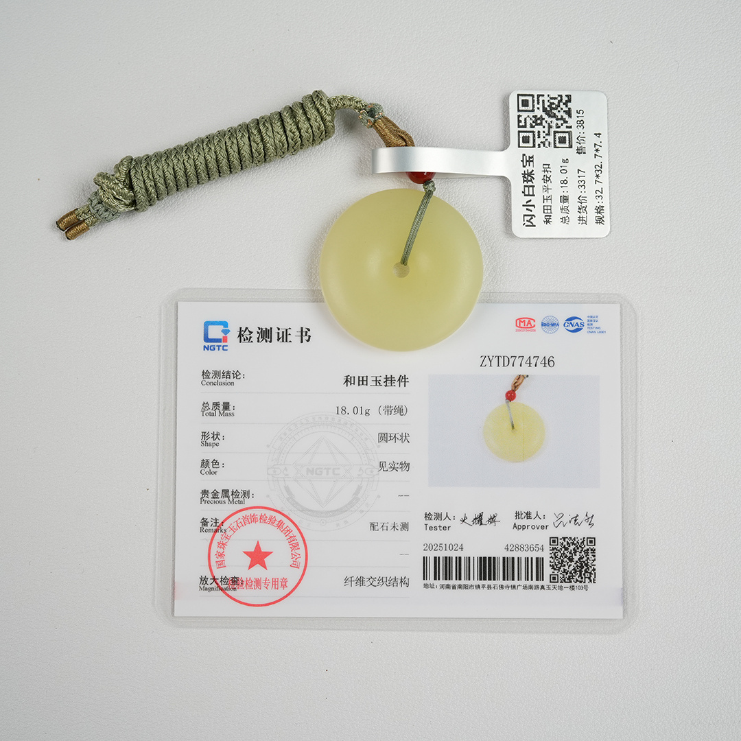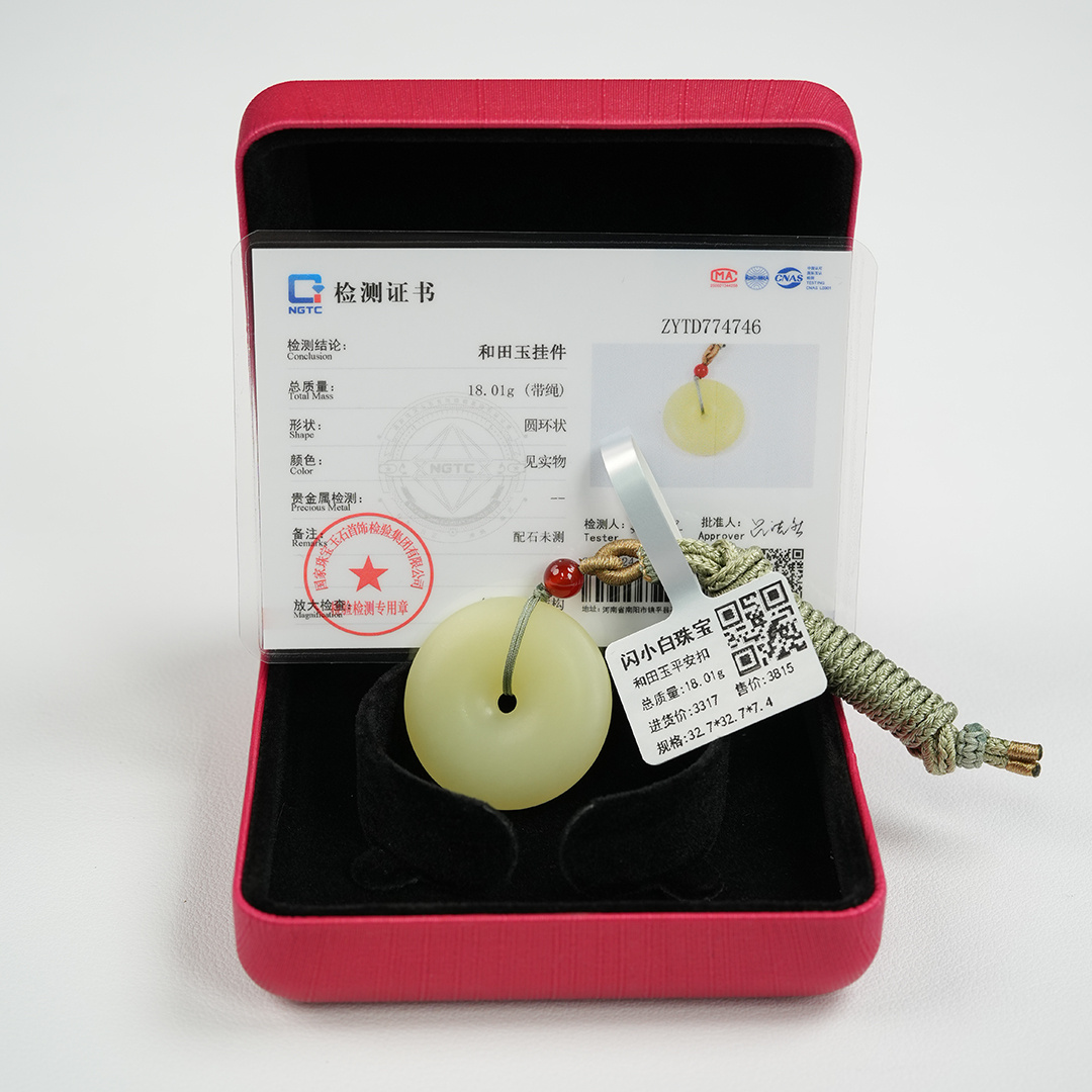 | 经检测 青海料和田玉平安扣,总质量18.01g,直径32.7mm厚7.4mm,细度好,结构均匀,有冰透感,无脏杂,无纹裂。 | |