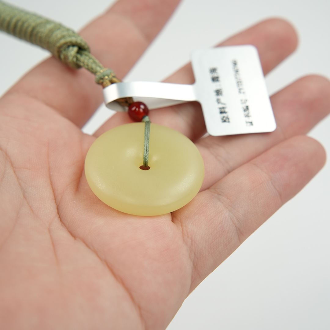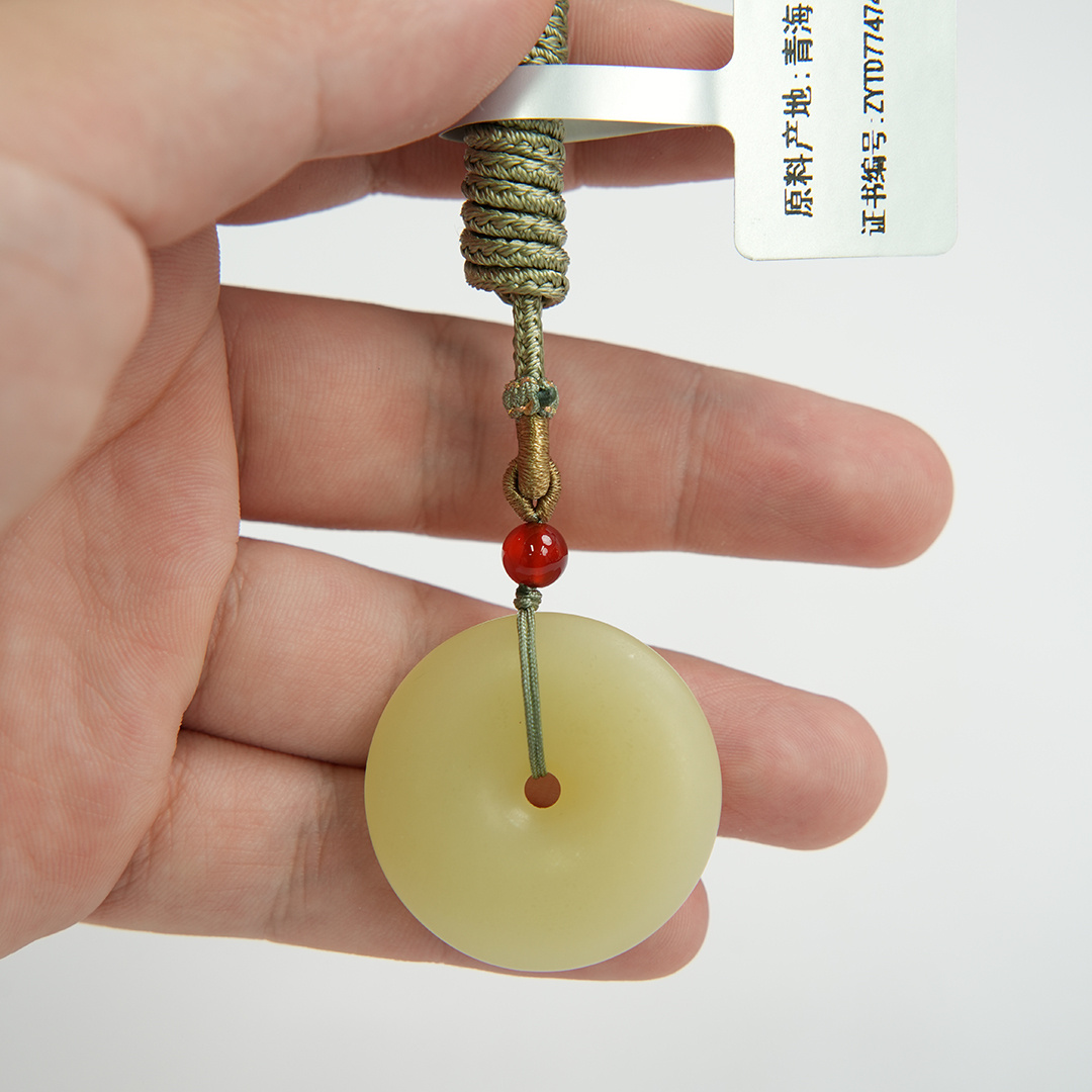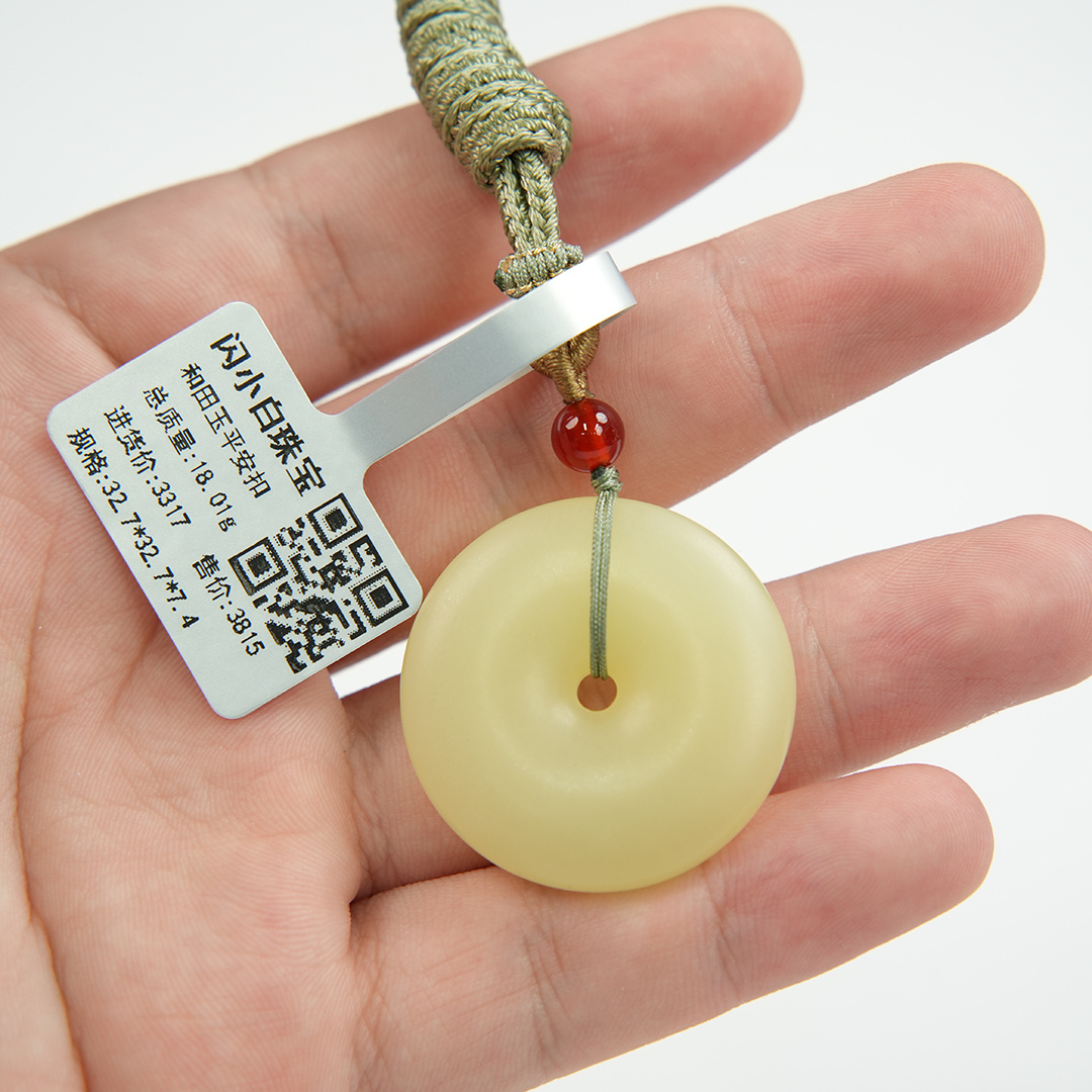 | 经检测 青海料和田玉平安扣,总质量18.01g,直径32.7mm厚7.4mm,细度好,结构均匀,有冰透感,无脏杂,无纹裂。 | |