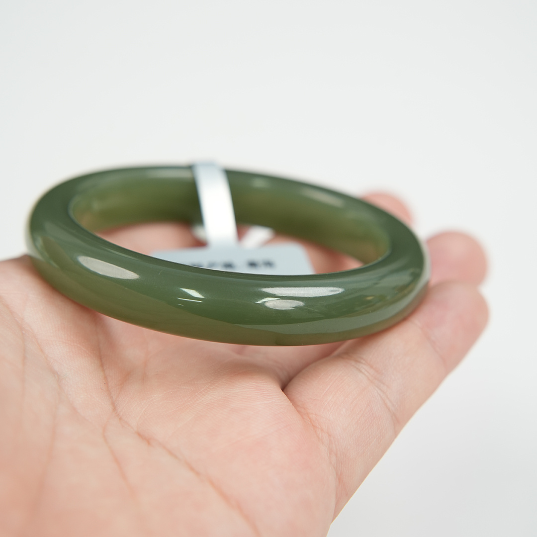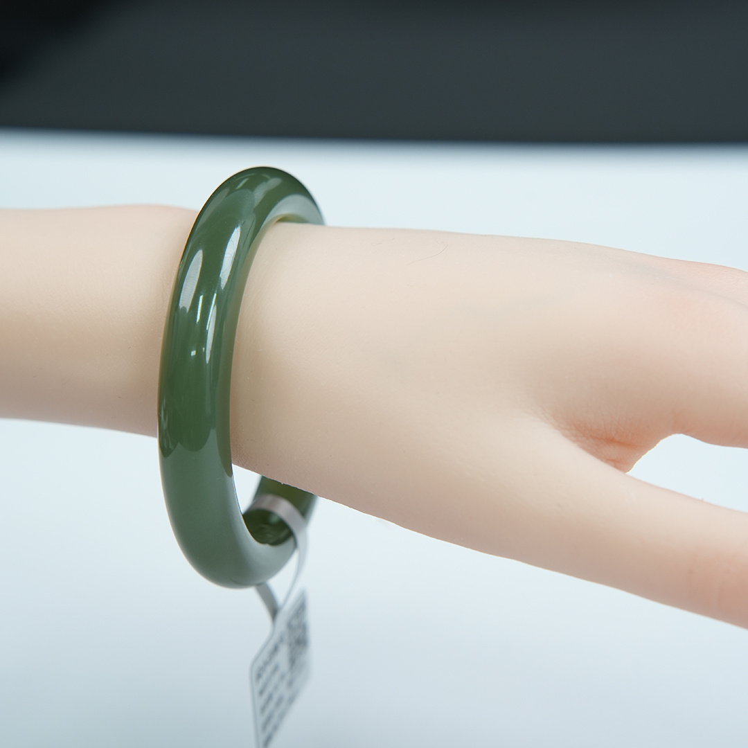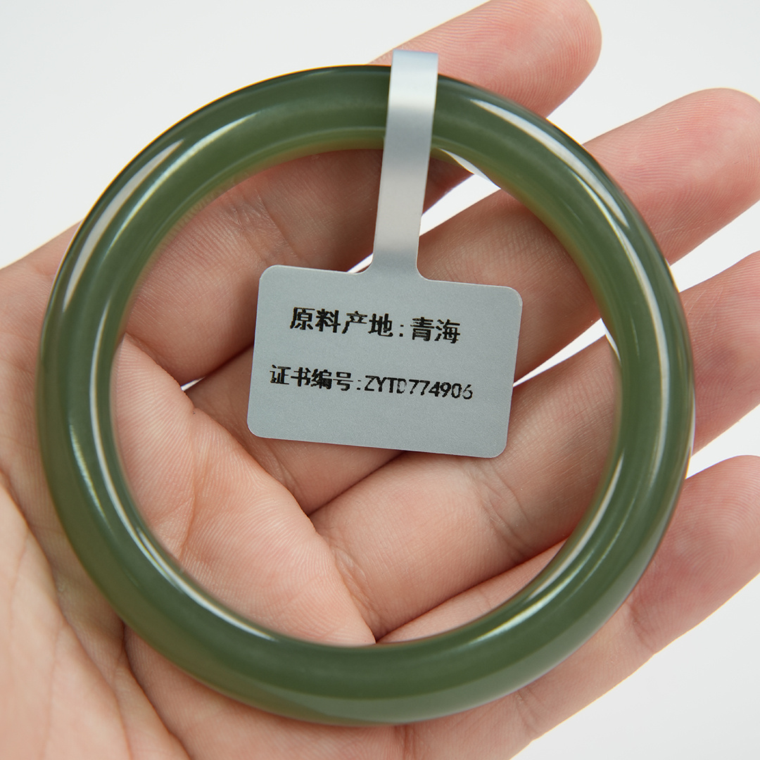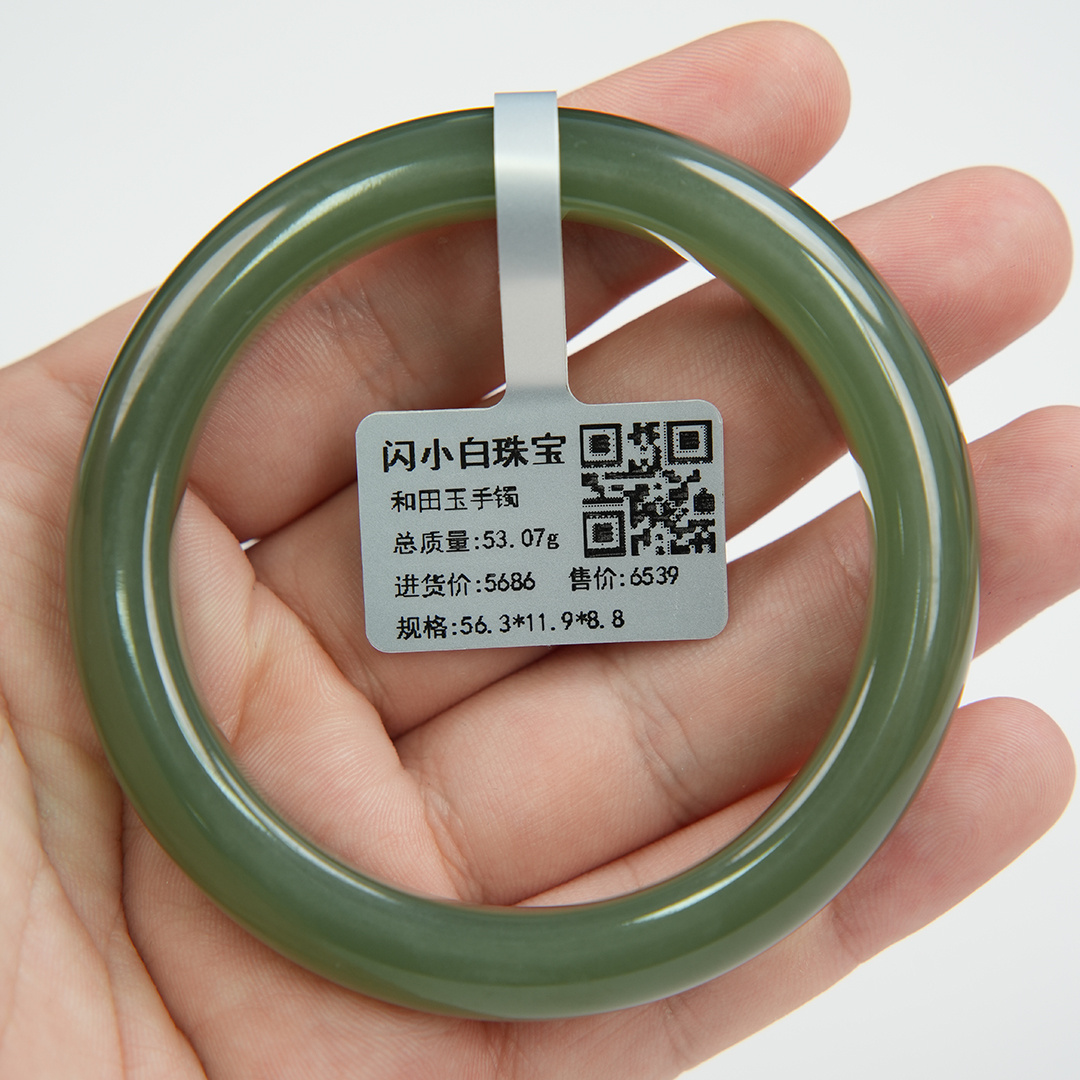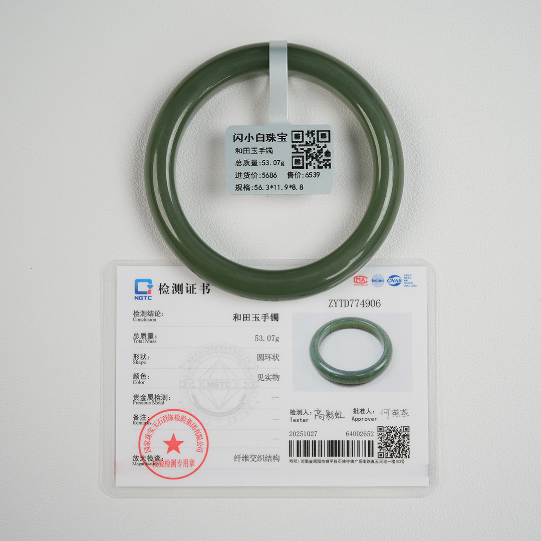 | 经检测 青海料和田玉手镯,总质量53.07g,圈口56.3mm,条宽11.9mm,条厚8.8mm,细度好,结构均匀,有冰透感,无脏杂,无纹裂。 | |